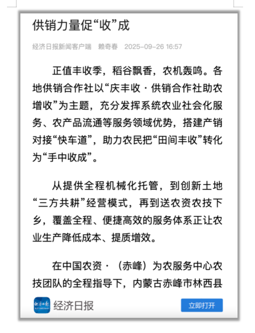 据了解,9月中旬以来,中国供销集团所属中国农业生产资料集团有限公司累计调度2万余家基层为农服务网点、1300余名服务人员坚守一线,以技术赋能、农机抢收、产销衔接等多举措,全方位保障秋粮稳产增收。