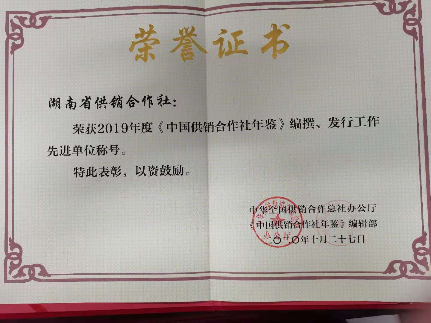 近日,全国总社办公厅、《中国供销合作社年鉴》编辑部对2019年度《中国供销合作社年鉴》工作进行总结表彰,省社被评为2019年度《中国供销合作社年鉴》编纂、发行工作先进单位。