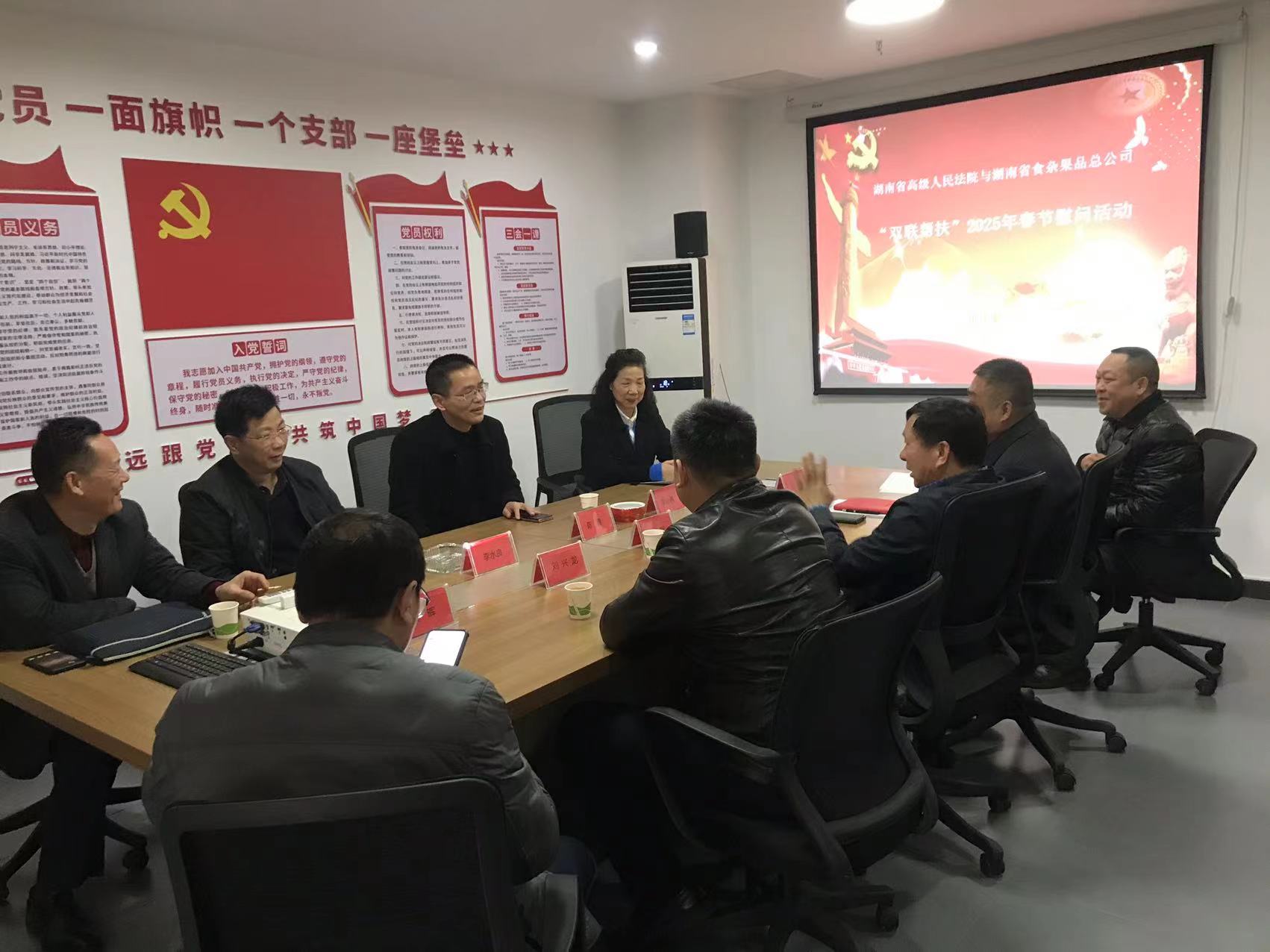 1月22日,湖南高院机关党委常务副书记陈勇率机关党委、政治部、司装处三个党支部负责同志到省供销社社有企业湖南省食杂果品总公司开展春节送温暖慰问活动,深入走访慰问特困企业和16名困难党员、困难职工,把党组织的温暖送到了困难群众的心坎上。