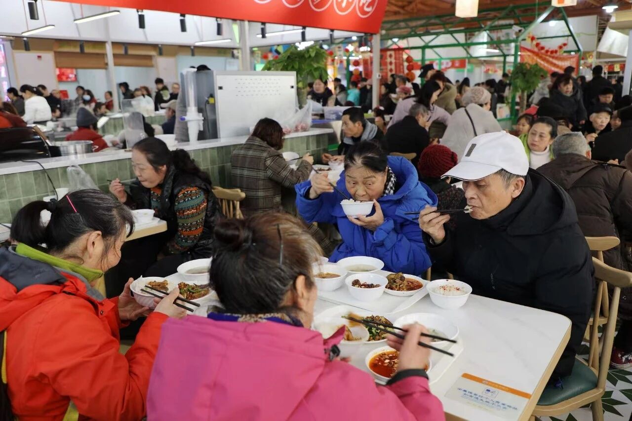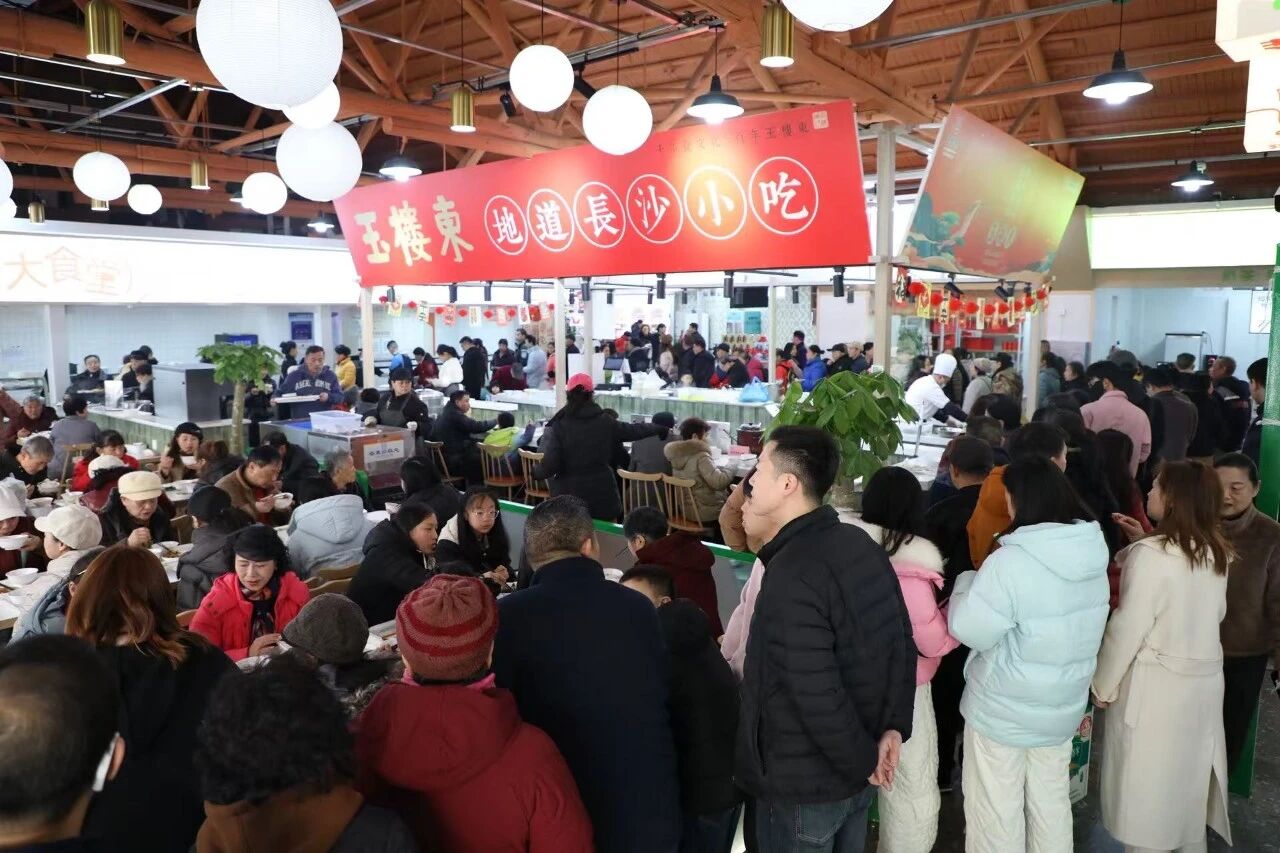 中午时分,杀猪宴正式开餐。取餐区陈列着热气腾腾的各类杀猪菜,组成了一桌地道的湖湘年味盛宴。市民凭活动消费凭证有序排队,领取心仪的菜品。队伍秩序井然,工作人员快速分餐,确保每位参与者都能及时品尝到新鲜出锅的佳肴。用餐区座无虚席,市民们与家人邻居围坐一桌,每桌均配备公勺公筷,大家共享丰盛的年猪宴时,也交流着对传统年俗的记忆与新体验。活动通过多个直播平台同步呈现,主播们现场带观众“云逛集市”、学选食材、看年猪分解,直播间互动热烈,知识性与趣味性兼备。