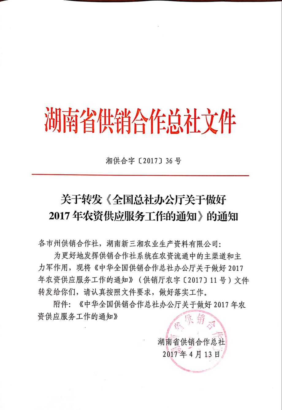关于转发《全国总社办公厅关于做好2017年农资供应服务工作的通知》的通知