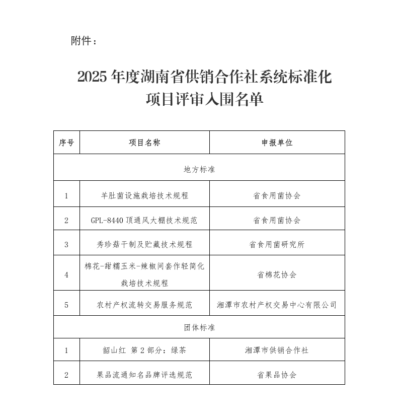 关于公示2025年度湖南省供销合作社系统标准化项目评审结果的通知