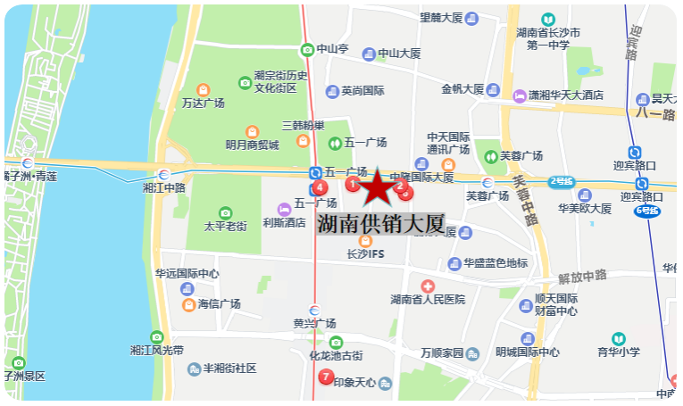 长沙市芙蓉区五一大道153号(新世界百货商场),五一大道旁,紧邻城市主干道。地铁1、2号线五一广场站5号口出口处,交通便捷。